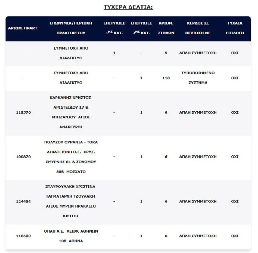 Τα δελτία που κερδίζουν συμπληρώθηκαν σε Αγίους Αναργύρους, Μοσχάτο, Λεωφόρο Αθηνών, Ηράκλειο και ένα μέσω διαδικτύου.