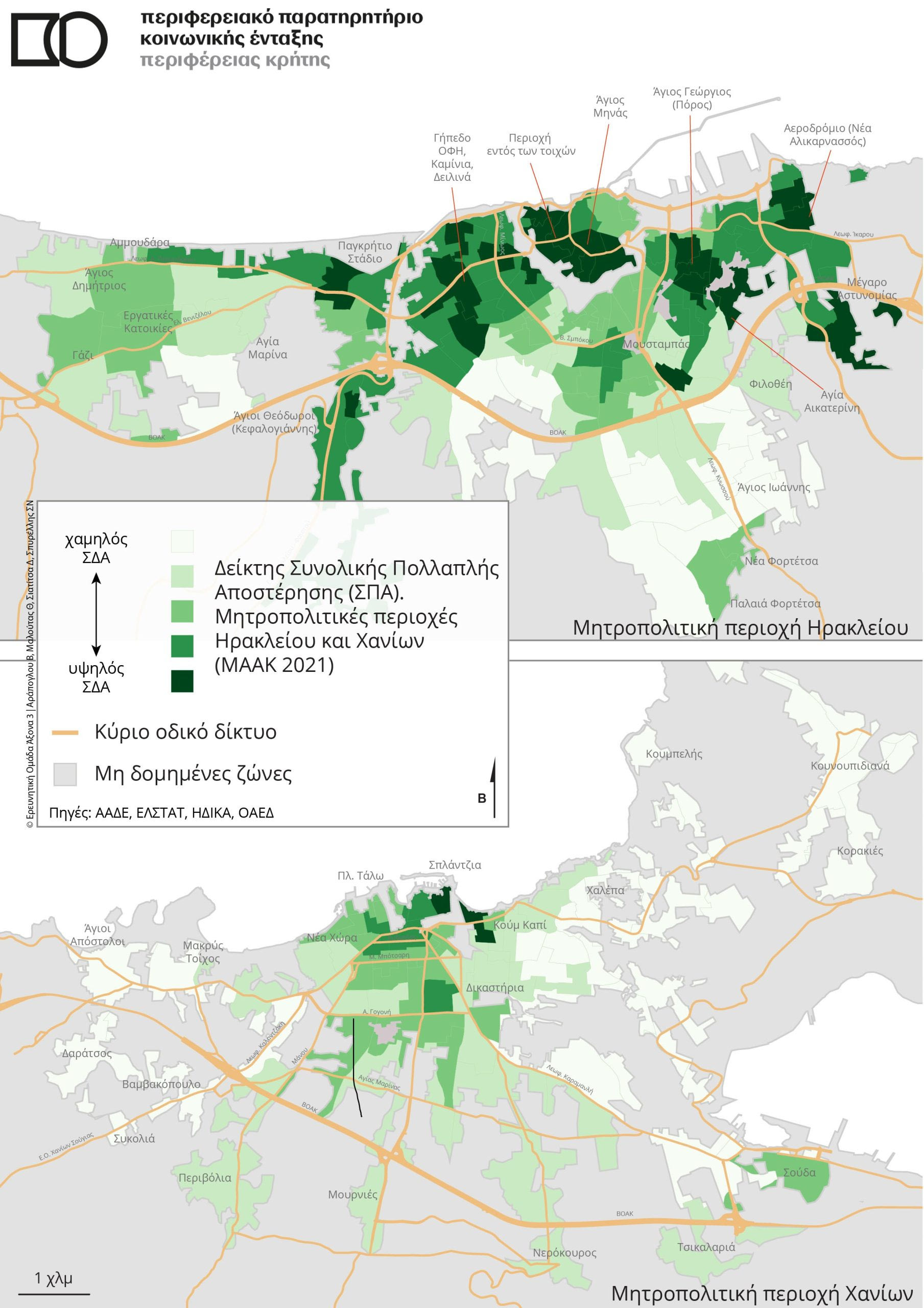 Η Αγία Τριάδα, η περιοχή του Λάκκου, ένα τμήμα του Πόρου και κάποια τμήματα της Ν. Αλικαρνασσού. Σε ό,τι αφορά την αντίστοιχη χαρτογράφηση της Κρήτης, τα στοιχεία αποτυπώνουν ότι ο δείκτης συνολικής πολλαπλής αποστέρησης «χτυπάει κόκκινο» στον ανατολικό νότο της Κρήτης, όπου σε κάθε δήμο υπάρχουν σημαντικές περιοχές που δοκιμάζονται από τη φτώχεια, την ανεργία, την ανειδίκευτη εργασία, τη χαμηλή εκπαίδευση, την ελλιπή προσβασιμότητα στις υπηρεσίες πρόνοιας και υγείας.