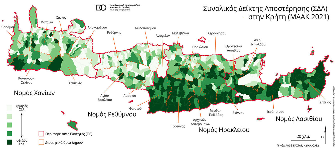 Η έρευνα έχει καταγράψει ότι οι περισσότερο αποστερημένες περιοχές εντοπίζονται στην ανατολική Κρήτη και συγκεκριμένα στις περιφερειακές ενότητες Ηρακλείου και Λασιθίου, ενώ παράλληλα ενδιαφέρον παρουσιάζει και η εστίαση που γίνεται στον αστικό πυρήνα του Ηρακλείου, στον οποίο καταγράφονται σημαντικοί θύλακες κοινωνικής αποστέρησης. Ανάμεσα σε αυτούς είναι περιοχές όπως τα Δειλινά και τα Καμίνια.