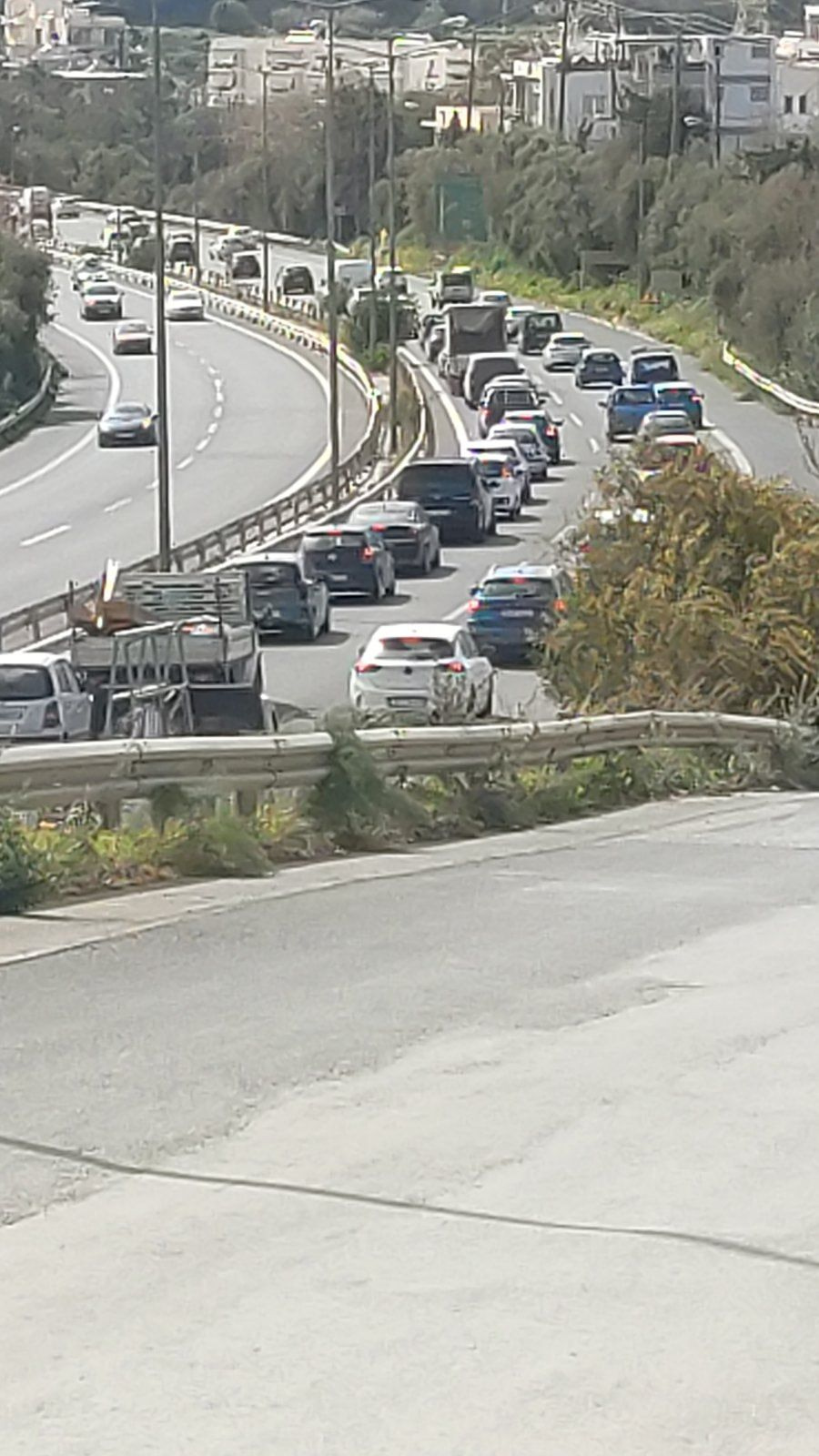 Τα αυτοκίνητα κινούνται με …βήμα σημειωτόν και η ταλαιπωρία των οδηγών που έχουν ολοκληρώσει την εργασία τους και θέλουν να φθάσουν στα σπίτια τους, πολύ μεγάλη.