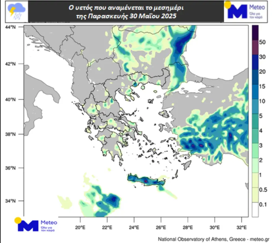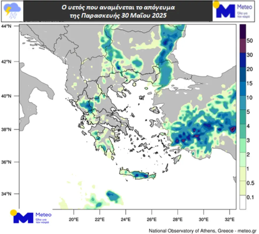 Ωστόσο, οι βροχές και καταιγίδες θα ενισχυθούν εκ νέου από το πρωί έως τις πρώτες βραδινές ώρες του Σαββάτου 31/05.