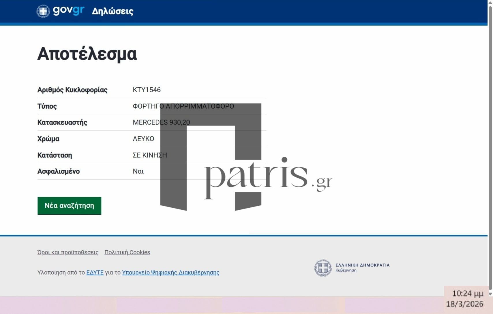 Το γεγονός ότι το καμένο απορριμματοφόρο του Δήμου εμφανίζεται ακόμη ασφαλισμένο και ως ενεργό στο gov.gr προκαλεί σοβαρά και απολύτως εύλογα ερωτήματα. Και αυτό δεν είναι ισχυρισμός ή υπερβολή, αλλά προκύπτει από το σχετικό στοιχείο που επισυνάπτουμε μετά από σχετική έρευνα που κάναμε.