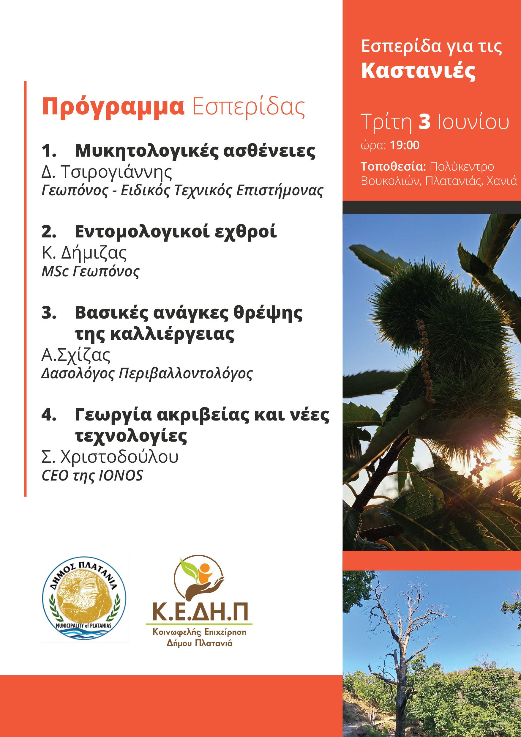 Ο Δήμος Πλατανιά σε συνεργασία με την ΚΕΔΗΠ (Κοινωφελή Επιχείρηση Δήμου Πλατανιά) σας προσκαλούν, στην Εσπερίδα που διοργανώνουν την Τρίτη 3 Ιουνίου, ώρα 19:00, η οποία θα λάβει χώρα στο Πολύκεντρο Βουκολιών, με θέμα:
