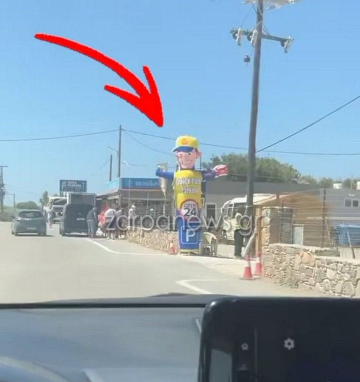 Πλέον στην είσοδο του πάρκινγκ εμφανίζεται μια φουσκωτή κούκλα η οποία κουνάει το χέρι της, δείχνοντας την κατεύθυνση του χώρου στάθμευσης για να ενημερώνει τους οδηγούς, όπως φαίνεται στη φωτογραφία του zarpanews.gr.