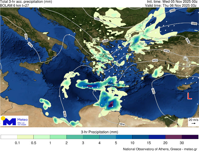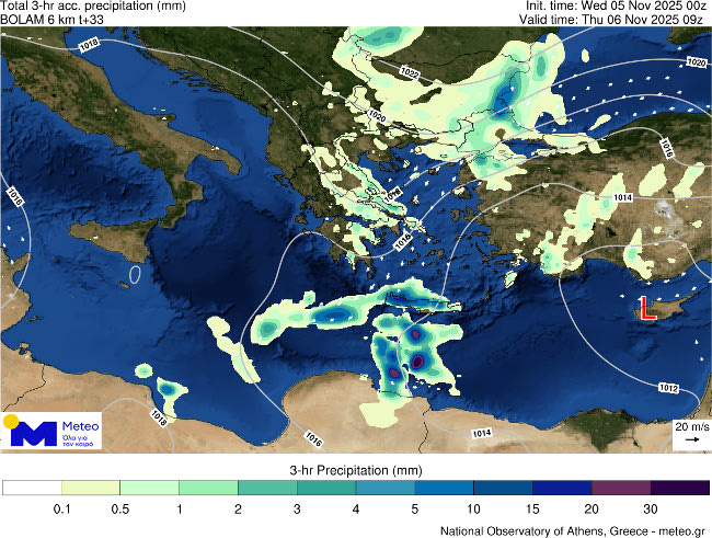 Σύμφωνα με τα νεότερα προγνωστικά στοιχεία του Εθνικού Αστεροσκοπείου Αθηνών/meteo.gr, την Πέμπτη 06/11 αναμένονται τοπικές βροχές και καταιγίδες στα ανατολικά και νότια, με έμφαση στην Κρήτη. Τα φαινόμενα κατά τόπους στα βόρεια τμήματα της Κρήτης θα είναι έντονα.