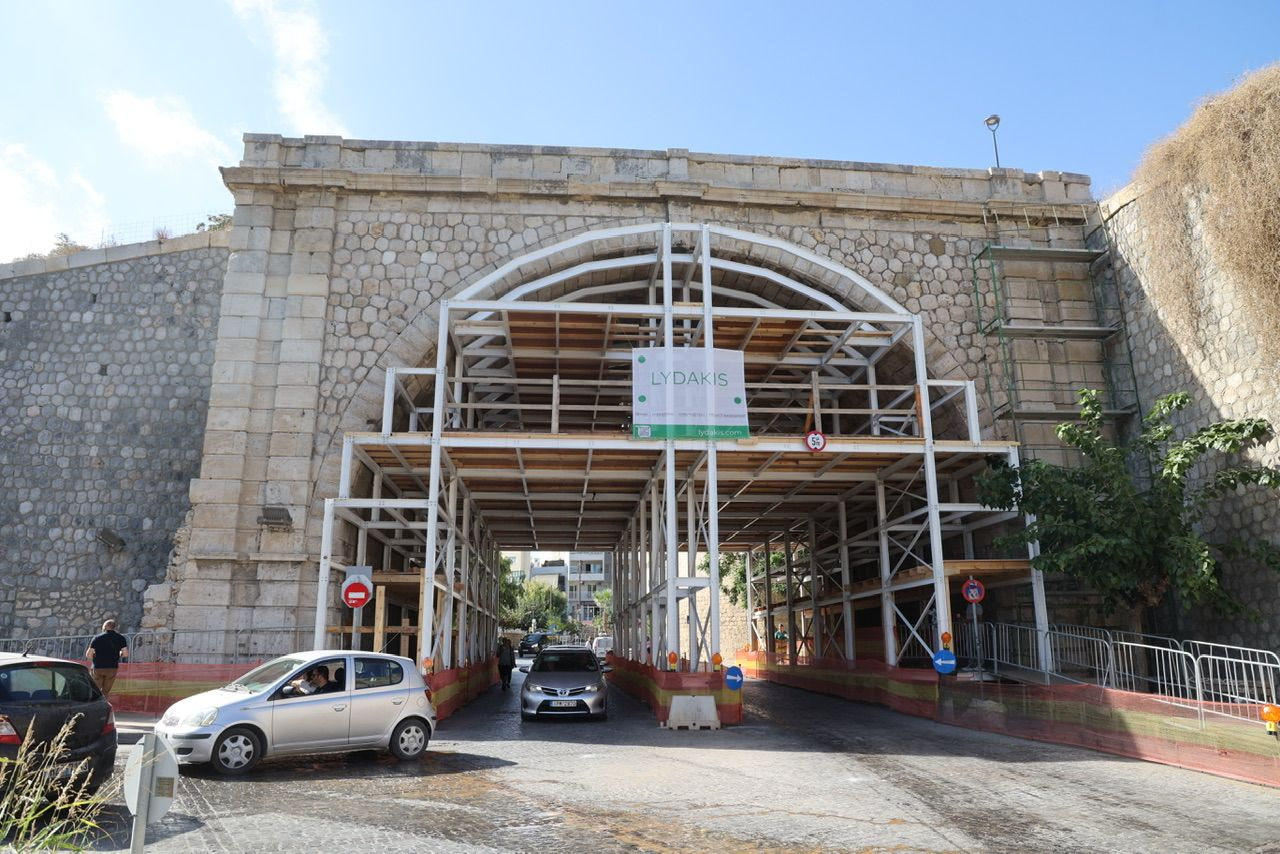 Ο Δήμαρχος Ηρακλείου είδε από κοντά το πλέγμα σκαλωσιών που έχει τοποθετηθεί στο εσωτερικό της Χανιόπορτας έτσι ώστε να ξεκινήσουν οι εργασίες αποκατάστασης των βλαβών που εντοπίζονται εσωτερικά του τόξου του γεφυρώματος, όπου παρατηρείται πολύ έντονη υγρασία, διαρροή νερού, εγκάρσιες ρωγμές και αποσάθρωση του συνδετικού κονιάματος.