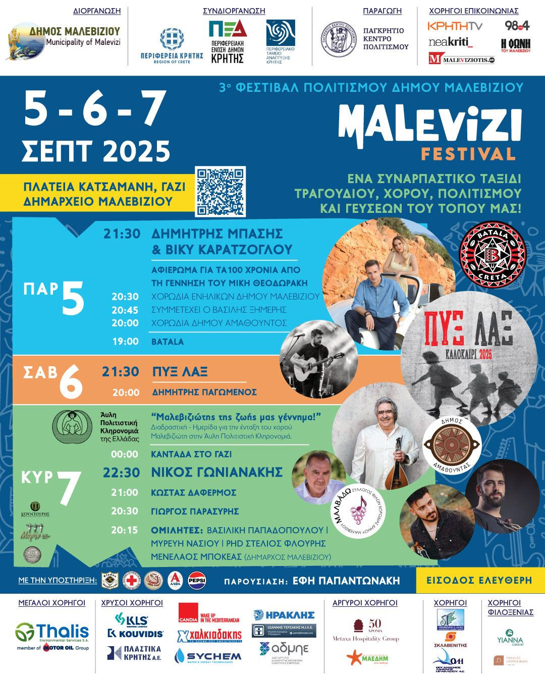 Η καρδιά της μουσικής, της παράδοσης και του πολιτισμού θα χτυπήσει στο Μαλεβίζι το τριήμερο 5, 6 και 7 Σεπτεμβρίου, στην πλατεία Μιχάλη Κατσαμάνη στο Γάζι, όπου θα πραγματοποιηθεί το 3ο Malevizi Festival.