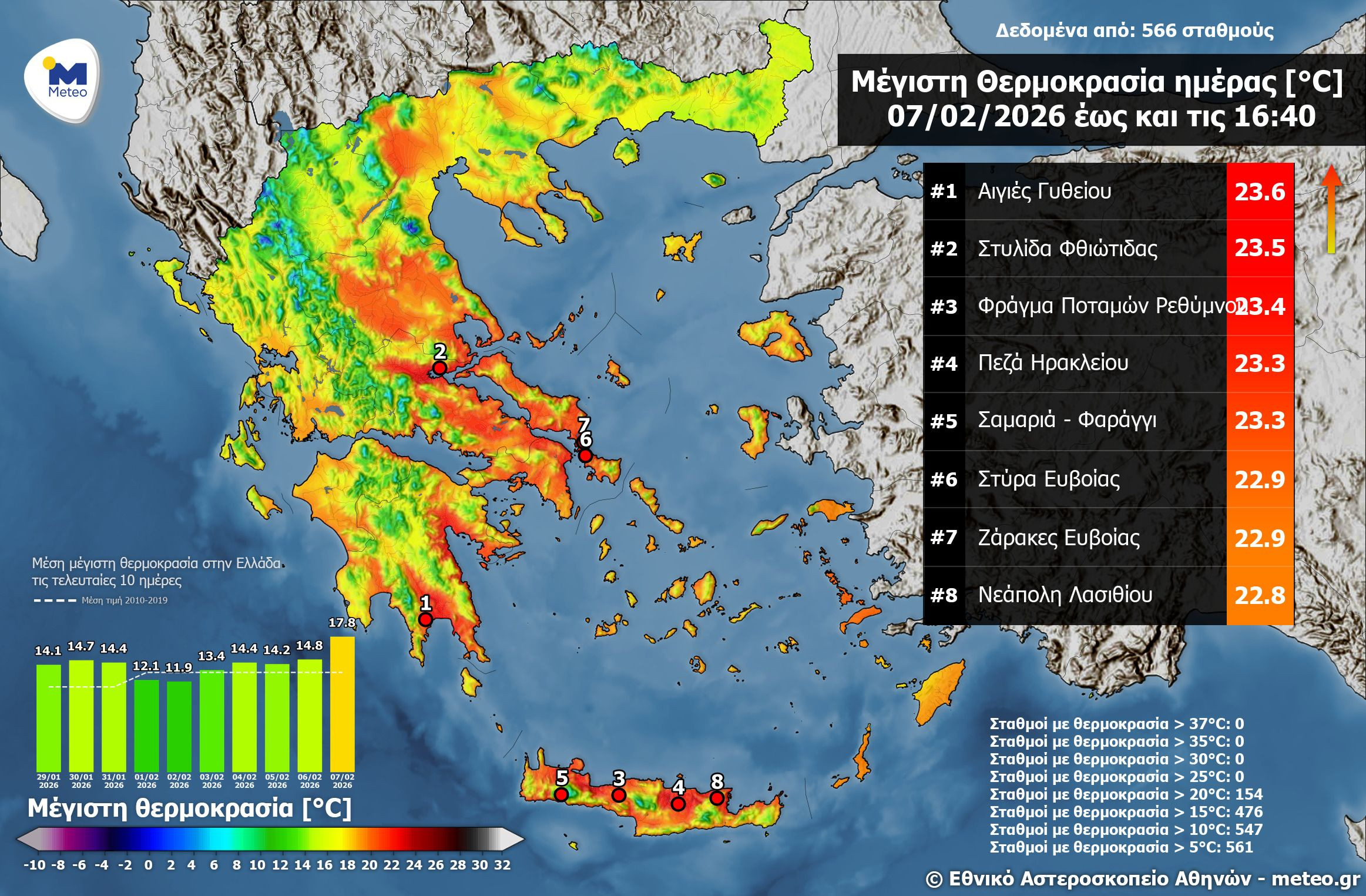 Σύμφωνα με το δίκτυο αυτόματων μετεωρολογικών σταθμών του Εθνικού Αστεροσκοπείου Αθηνών / meteo.gr, η υψηλότερη μέγιστη θερμοκρασία καταγράφηκε στις Αιγιές Γυθείου με 23,6 °C.
