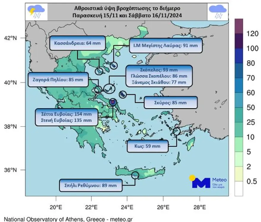Σε συμφωνία με τα προγνωστικά δεδομένα σημαντικές βροχοπτώσεις σημειώθηκαν το διήμερο Παρασκευή 15/11 και Σάββατο 16/11/2024, στην Εύβοια, στις Σποράδες, στη Μαγνησία, στη Νότια Χαλκιδική και σε τμήματα του Ανατολικού Αιγαίου, των Δωδεκανήσων και της Κρήτης. Στον χάρτη που ακολουθεί αποτυπώνονται τα αθροιστικά ύψη βροχόπτωσης του διημέρου έως τις 19:00 το βράδυ του Σαββάτου 16/11, όπως αυτά καταγράφηκαν από 513 μετεωρολογικούς σταθμούς του δικτύου αυτόματων μετεωρολογικών σταθμών του Εθνικού Αστεροσκοπείου Αθηνών / meteo.gr, ενώ επισημαίνονται ενδεικτικά ύψη βροχής.