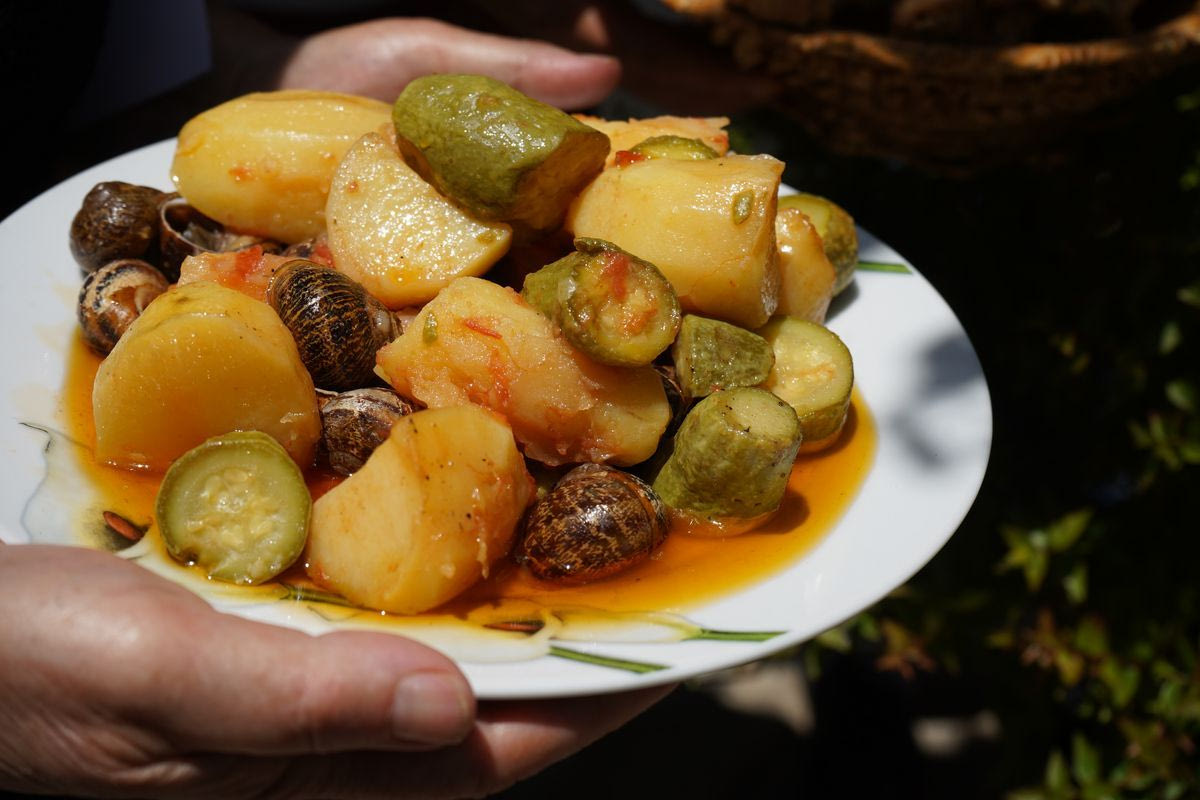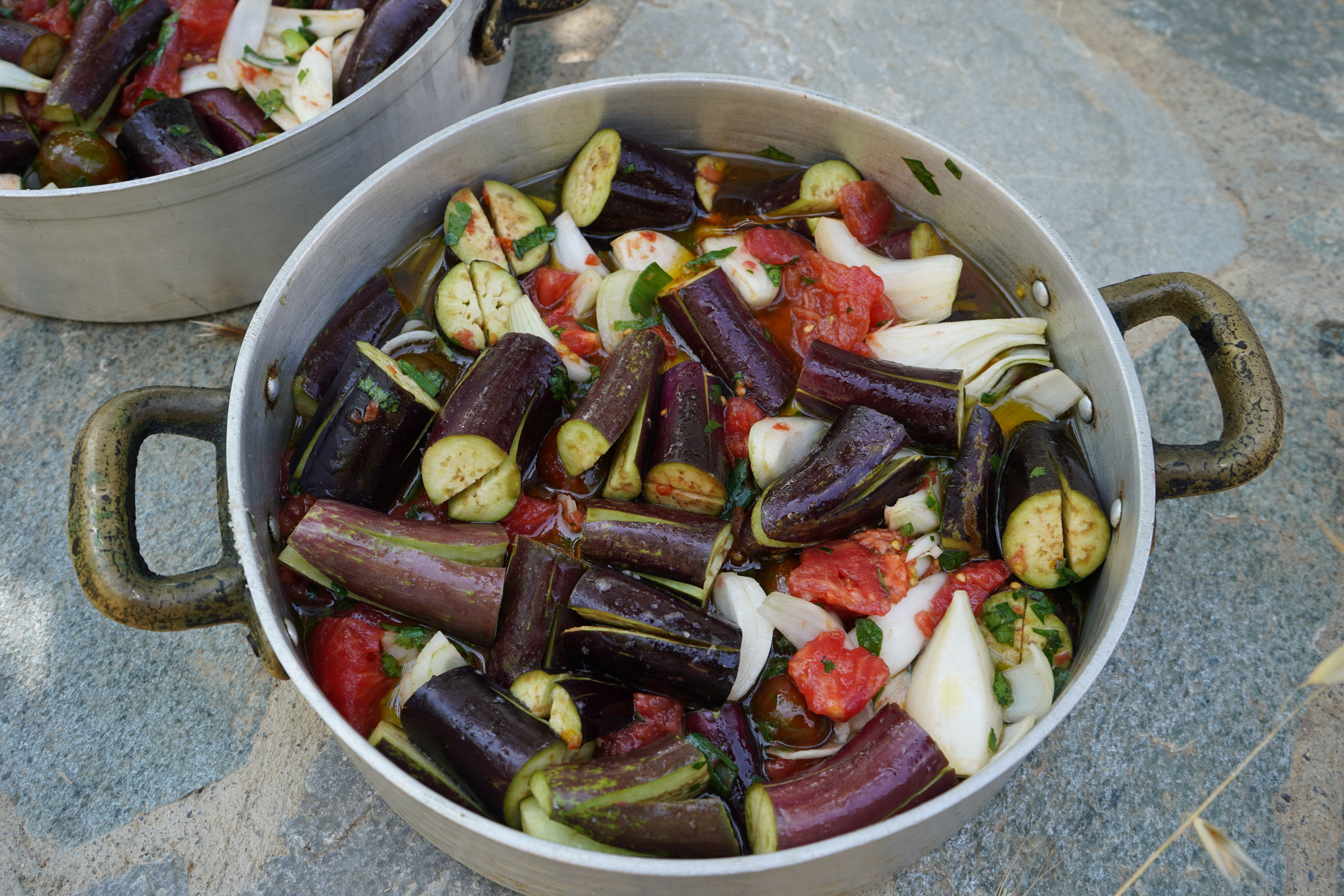 Αποστολιανό ασπρομάτικο φασόλι με πλατσόραβδα, συμπεθεριό του κήπου, ντολμάδες με στάρι, μελιτζάνες γιαχνί, ρεβίθια κοκκινιστά, ρεβίθια με πράσα, πλακί γιαχνί, μελιτζάνες στο τηγάνι, βρουβόπιτες, ντολμαδάκια με αμπελοβλαστούς, βλίτα γιαχνί, κουκόφαβα, χοχλιοί με πατάτες και κολοκύθια, σταρένιο ψωμί, εφτάζυμο ψωμί και ντάκο, κρητικά λουκούμια, λαδοκούλουρα.