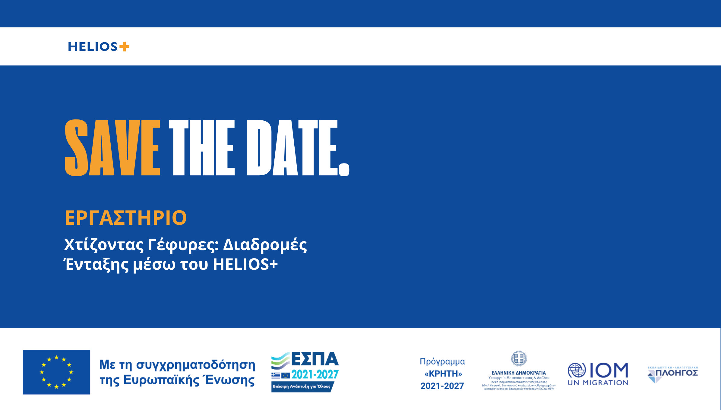 Το εργαστήριο στοχεύει στην πληροφόρηση για το περιεχόμενο, τους στόχους και τα αναμενόμενα αποτελέσματα της πράξης «HELIOS+: Ολοκληρωμένες δράσεις ένταξης πολιτών τρίτων χωρών στην αγορά εργασίας στην Περιφέρεια Κρήτης» η οποία υλοποιείται με δικαιούχο τον Διεθνή Οργανισμό Μετανάστευσης και συνδικαιούχο την Εκπαιδευτική Αναπτυξιακή Πλοηγός στο πλαίσιο του προγράμματος «ΚΡΗΤΗ» 2021-2027, με συγχρηματοδότηση από το Ευρωπαϊκό Κοινωνικό Ταμείο+ (ΕΚΤ+).