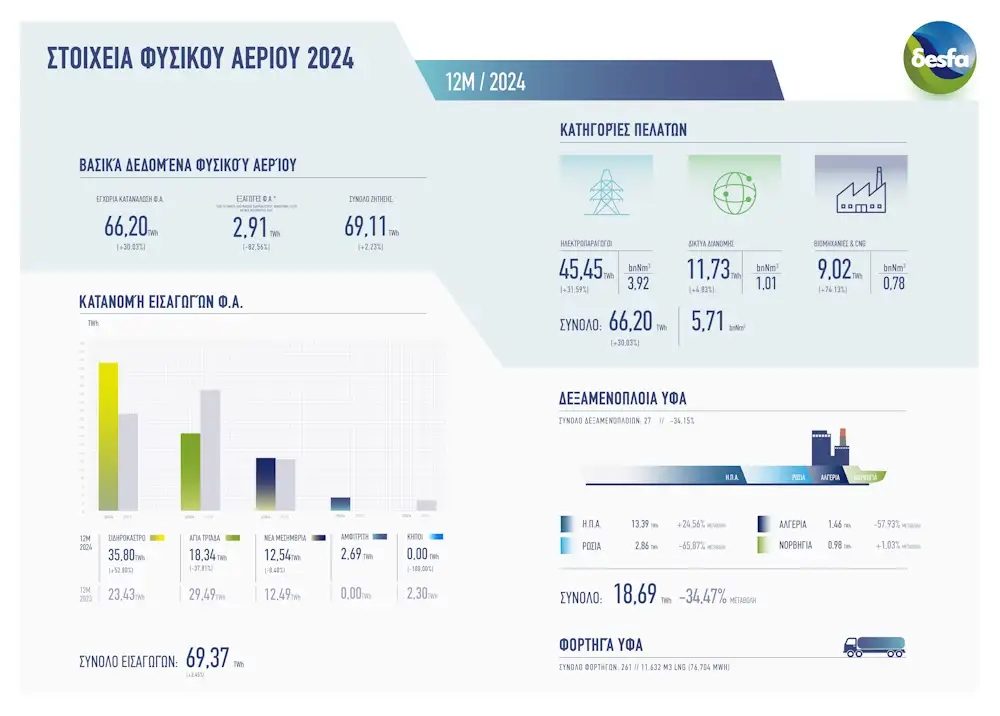 Σύμφωνα με τα σχετικά στοιχεία του ΔΕΣΦΑ για το 2024, η συνολική ζήτηση (εγχώρια κατανάλωση & εξαγωγές) φυσικού αερίου αυξήθηκε κατά 2,23%, φθάνοντας τις 69,11 Τεραβατώρες (TWh) από 67,6 TWh το 2023. Σημαντική αύξηση σε ποσοστό 30,03% καταγράφηκε στην εγχώρια κατανάλωση, η οποία ανήλθε στις 66,2 TWh από 50,91 TWh, ενώ αντιθέτως μειώθηκαν οι εξαγωγές φυσικού αερίου κατά 82,56% από 16,69 TWh το προηγούμενο έτος.