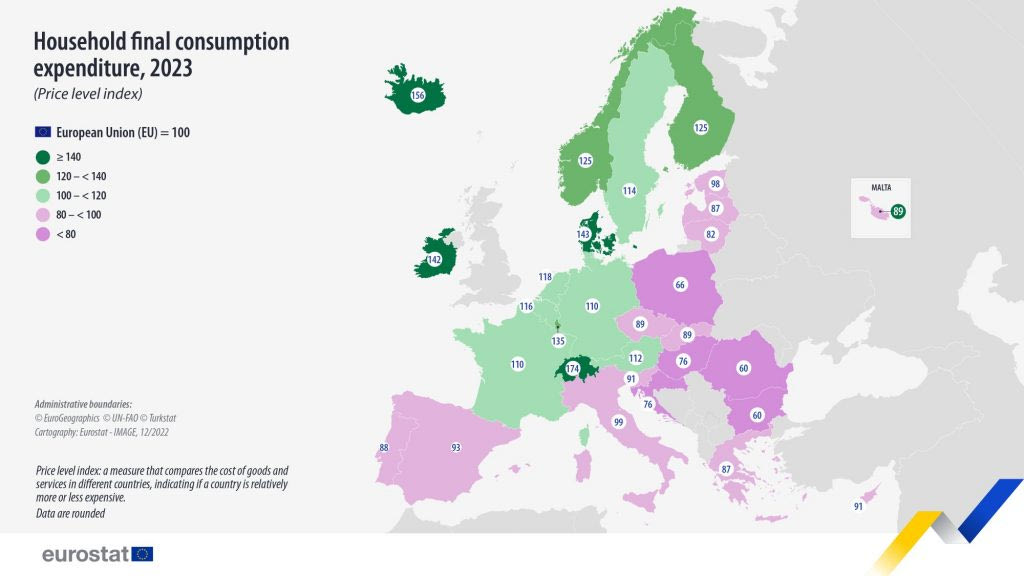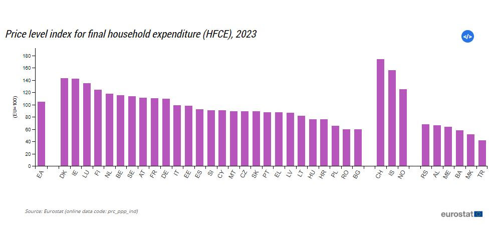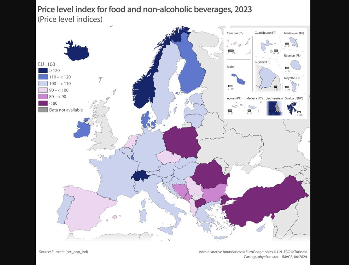 Τα επίπεδα τιμών για τα τρόφιμα, τα ποτά και τον καπνό διαφέρουν σημαντικά μεταξύ των κρατών μελών της ΕΕ. Το 2023, οι τιμές στα τρόφιμα και τα μη αλκοολούχα ποτά στο Λουξεμβούργο ήταν 19% πάνω από τον μέσο όρο της ΕΕ, ενώ στη Ρουμανία ήταν 26% κάτω από τον μέσο όρο της ΕΕ.