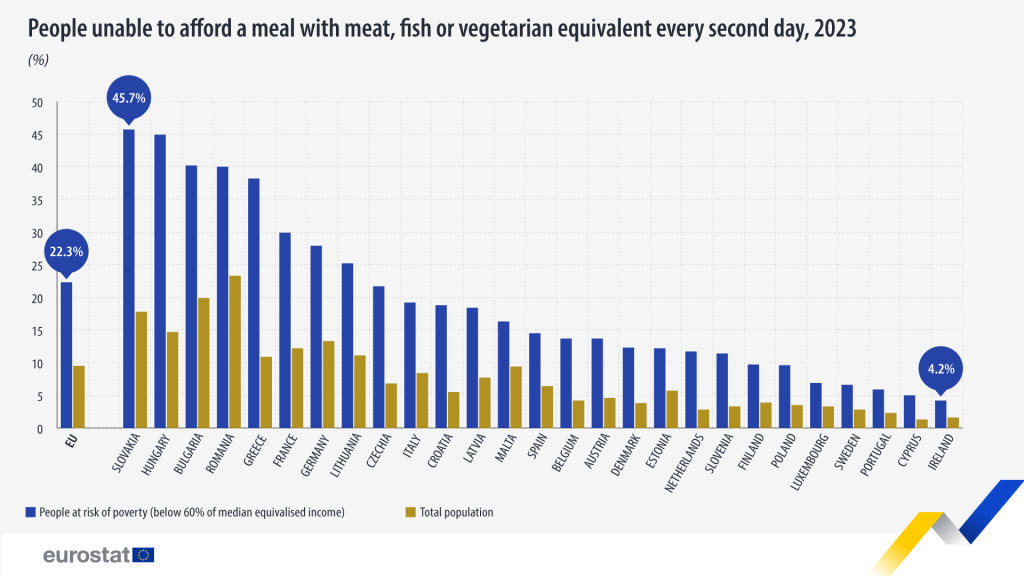 Το υψηλότερο ποσοστό των ατόμων που διατρέχουν κίνδυνο φτώχειας και δεν μπορούν να βάλουν το τραπέζι τους ένα σωστό γεύμα καταγράφηκε στη Σλοβακία (45,7%). Ακολουθούν η Ουγγαρία (44,9%), η Βουλγαρία (40,2%) και η Ρουμανία (40%) Από την άλλη πλευρά, το χαμηλότερο ποσοστό καταγράφηκε στην Ιρλανδία (4,2%). Ακολουθούν η Κύπρος (5,0%) και η Πορτογαλία (5,9%).