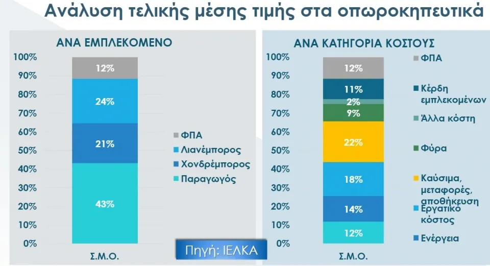 Κατά τη διαδρομή των οπωροκηπευτικών προϊόντων από το χωράφι στο ράφι του σούπερ μάρκετ, σε ό,τι αφορά τους εμπλεκόμενους στην εφοδιαστική αλυσίδα, η τιμή του παραγωγού αποτελεί το μεγαλύτερο κόστος, τα logistics και το εργασιακό κόστος είναι με διαφορά τα υψηλότερα στην αλυσίδα της αξίας, ενώ οι συνολικοί φόροι αντιπροσωπεύουν περίπου το 1/4 της τιμής.