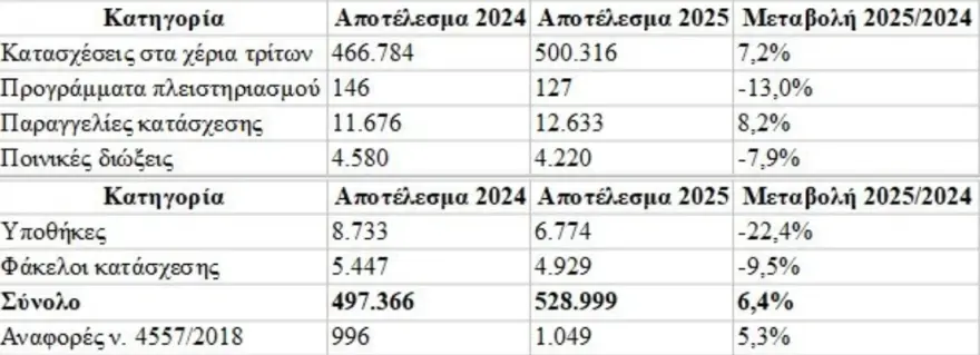 Συνολικά, τα αναγκαστικά μέτρα είσπραξης ξεπέρασαν τα 528.000, περιλαμβάνοντας κατασχέσεις, παραγγελίες κατάσχεσης, πλειστηριασμούς, υποθήκες και ποινικές διώξεις, ενώ αυξήθηκαν και οι αναφορές προς τις αρχές για υποθέσεις ξεπλύματος χρήματος. Στην πράξη, αυτό σημαίνει ότι η Εφορία χρησιμοποιεί πλέον κάθε διαθέσιμο εργαλείο για να πιέσει την είσπραξη των οφειλών.