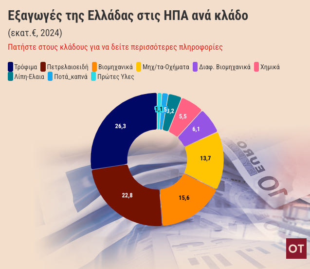 Σύμφωνα με στοιχεία του Ινστιτούτου Εξαγωγέων Ερευνών και Σπουδών (ΙΕΕΣ), το 2024 οι ελληνικές εξαγωγές προς τις Ηνωμένες Πολιτείες ανήλθαν σε 2,41 δισ. ευρώ, σημειώνοντας αύξηση 13,9% σε σύγκριση με το 2023 και 20,7% σε σχέση με το 2020. Σε κλαδικό επίπεδο, τα τρόφιμα και ποτά αποτελούν τον μεγαλύτερο εξαγωγικό κλάδο προς τις ΗΠΑ, με μερίδιο 30,6%, ακολουθούμενο από τα πετρελαιοειδή με 22,8% και τα βιομηχανικά είδη με 16,5%.