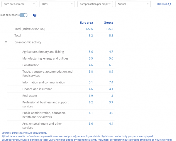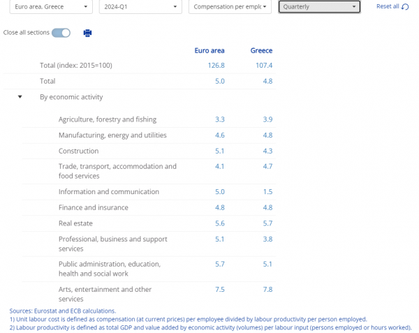 Οι μισθοί στην Ελλάδα αυξήθηκαν περισσότερο από τον πληθωρισμό στο α’ τρίμηνο του 2024, όπως και στην Ευρωζώνη, σύμφωνα με στοιχεία της Ευρωπαϊκής Κεντρικής Τράπεζας.