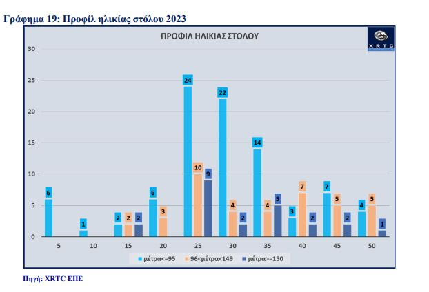 Όσον αφορά τα μεγέθη των πλοίων, όπως φαίνεται στο ακόλουθα γράφημα, άνω των 20 ετών είναι :