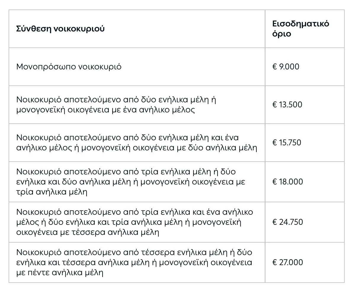 Για κάθε επιπλέον ενήλικο μέλος προστίθεται το ποσό των 4.500 ευρώ και για κάθε επιπλέον ανήλικο μέλος το ποσό των 2.250 ευρώ, μέχρι του συνολικού ορίου των 31.500 ευρώ ανεξαρτήτως του αριθμού των μελών του νοικοκυριού. Το συγκεκριμένο ανώτατο όριο (31.500 €) αυξάνεται κατά 8.000 ευρώ για νοικοκυριό που στη σύνθεσή του περιλαμβάνει και άτομο ή άτομα με αναπηρία εξήντα επτά τοις εκατό (67%) και άνω και κατά 15.000 ευρώ για νοικοκυριό που στη σύνθεσή του περιλαμβάνει και άτομο ή άτομα που έχουν ανάγκη μηχανικής υποστήριξης με χρήση ιατρικών συσκευών, η οποία παρέχεται κατ’ οίκον και είναι απαραίτητη για τη ζωή τους.