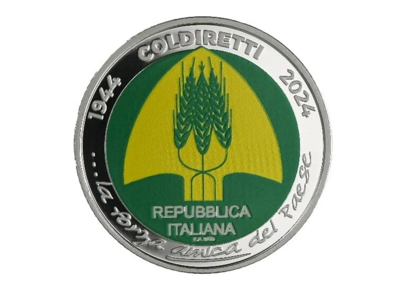Κατασκευασμένο από proof silver από τον καλλιτέχνη χαράκτη Emanuele Ferretti, το κέρμα διαθέτει ένα σχέδιο πλούσιο σε νόημα. Στην εμπρόσθια όψη του νομίσματος, στο κέντρο, ξεχωρίζει το λογότυπο Coldiretti: ένα κίτρινο φτυάρι σε πράσινο φόντο, ένα αδιαμφισβήτητο σύμβολο της γεωργίας, το οποίο περικλείει τρία αλληλένδετα στάχυα, που αντιπροσωπεύουν την παράδοση και τη γονιμότητα της γης.