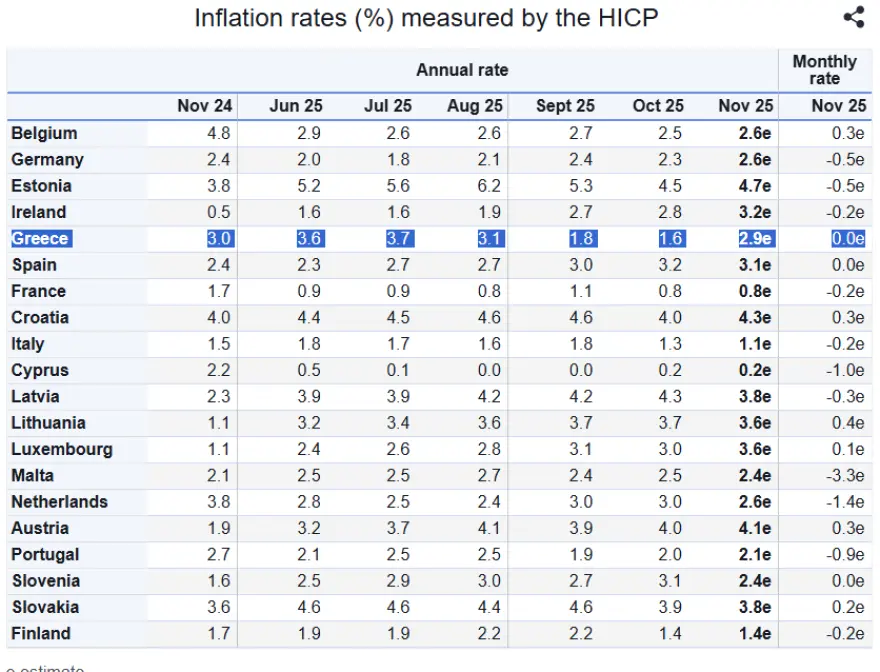Στο 2,9% διαμορφώθηκε ο πληθωρισμός στην Ελλάδα τον Νοέμβριο 2025, σύμφωνα με τα προκαταρκτικά στοιχεία της Ευρωπαϊκής Στατιστικής Υπηρεσίας. Υπενθυμίζεται ότι τον Οκτώβριο ο πληθωρισμός, σύμφωνα με την Eurostat, ήταν στο 1,6%.