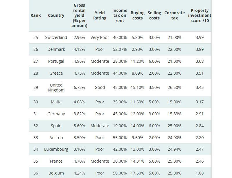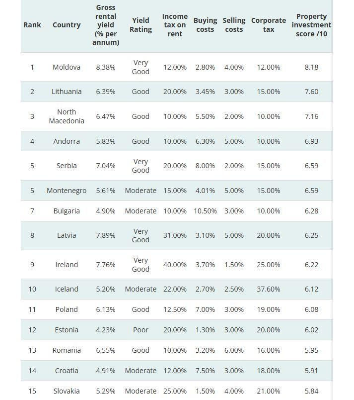 Στις χώρες με τις υψηλότερες ακαθάριστες αποδόσεις ενοικίασης, σε συνδυασμό με σχετικά χαμηλό μέσο φόρο εισοδήματος από ενοίκια, περιλαμβάνονται η Ανδόρα, το Μαυροβούνιο και η Βουλγαρία.