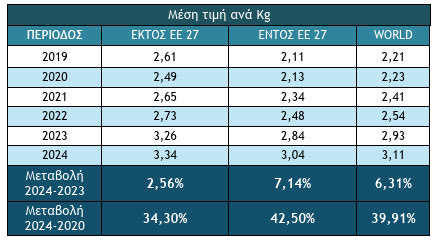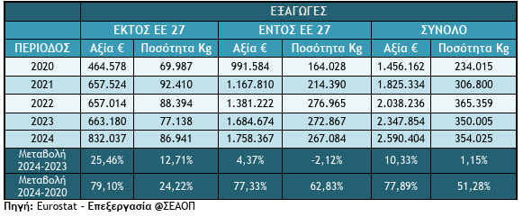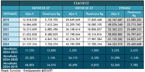 Ειδικότερα το 2024 σε σύγκριση με το 2023, οι εξαγωγές εντός ΕΕ-27, εμφάνισαν αύξηση 4,4 % σε αξία ενώ οι εξαγόμενες ποσότητες υποχώρησαν κατά 2,1%. Όσον αφορά τις Τρίτες Χώρες εμφανίζεται αξιοσημείωτη αύξηση τόσο σε αξία (25,5%) όσο και σε ποσότητες (12,8%).