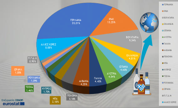 Η Γερμανία εμφανίζεται μεν σταθερά στην 1η θέση, ως η βασική χώρα προορισμού των ελληνικών αλκοολούχων ποτών, κατέχοντας το 35% σε αξία (€40,1 εκατ.) και το 43,5% σε ποσότητα (16 εκατ. κιλά) αλλά παρατηρείται υποχώρηση στις επιδόσεις της, αφού καταγράφηκε μείωση πέρυσι, κατά 5,75% σε αξία και 2,73% σε ποσότητες.
