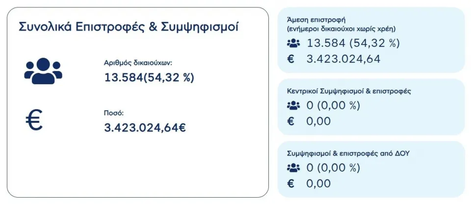 Έτσι από τα πρώτα 120.000 εκκαθαριστικά που εκδόθηκαν, τα μισά είναι μηδενικά, το ένα στα τέσσερα δίνει επιστροφή φόρου της τάξεως των 250 ευρώ, κατά μέσο όρο και το 1/4 είναι χρεωστικό με μέσο όρο φόρου τα 1.000 ευρώ.