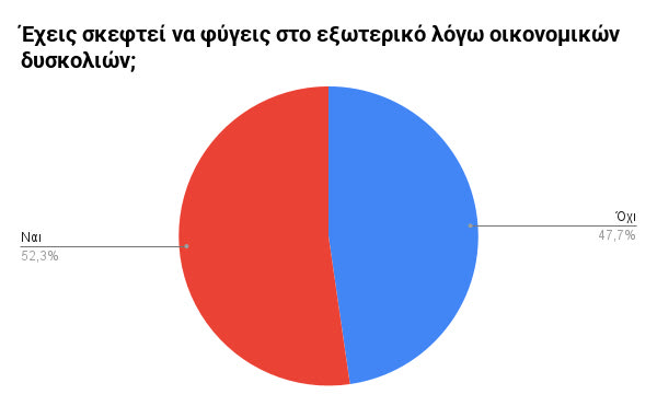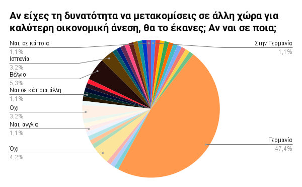 Πολλοί νέοι δηλώνουν πρόθυμοι να φύγουν από τη χώρα για καλύτερες οικονομικές συνθήκες. Η πρόθεση φυγής είναι έντονη, με την Γερμανία να είναι η πρώτη επιλογή για πολλούς, καθώς προσφέρει υψηλότερους μισθούς, καλύτερες επαγγελματικές ευκαιρίες και γενικά μια πιο σταθερή οικονομική πραγματικότητα.