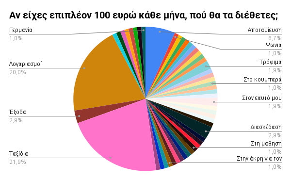 Αν οι νέοι είχαν επιπλέον 100 ευρώ στο μηνιαίο τους εισόδημα, η πλειοψηφία θα τα χρησιμοποιούσε για αποταμίευση, προσπαθώντας να δημιουργήσουν οικονομικό “μαξιλάρι” για το μέλλον. Οι βασικές ανάγκες, όπως τρόφιμα, λογαριασμοί και ψώνια για το σπίτι, αποτελούν επίσης σημαντική προτεραιότητα. Ορισμένοι θα τα ξόδευαν για διασκέδαση, εκπαίδευση ή προσωπική φροντίδα, ενώ μερικοί θα τα χρησιμοποιούσαν για βενζίνη ή την αγορά αυτοκινήτου. Συνολικά, οι νέοι προσπαθούν να καλύψουν τις καθημερινές τους ανάγκες, ενώ η αποταμίευση και η εξοικονόμηση για το μέλλον παραμένουν στην κορυφή των προτεραιοτήτων τους.