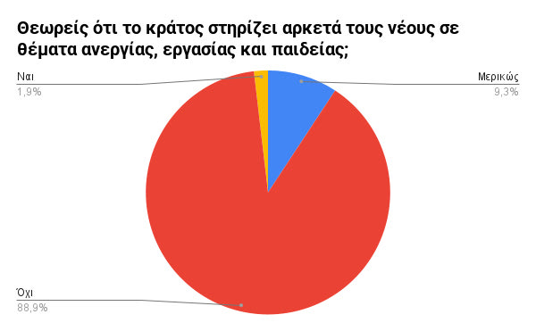 Σύμφωνα με την έρευνα, οι νέοι στην Ελλάδα πιστεύουν ότι το κράτος δεν παρέχει αρκετή οικονομική στήριξη. Σε τομείς όπως η ανεργία, η εργασία και η παιδεία, οι περισσότεροι δηλώνουν ότι δεν νιώθουν υποστήριξη από το κράτος για να μπορέσουν να τα βγάλουν πέρα στις δύσκολες συνθήκες της σημερινής κοινωνίας.