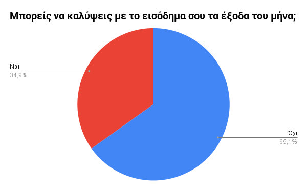 Η πλειονότητα των νέων, σύμφωνα με τις απαντήσεις που καταγράφηκαν, δεν θεωρεί το μηνιαίο τους εισόδημα επαρκές για να καλύψει τις καθημερινές τους ανάγκες. Οι περισσότερες απαντήσεις δείχνουν ότι οι νέοι δυσκολεύονται να περάσουν τον μήνα με το διαθέσιμο εισόδημα, καθώς πολύ συχνά απαντούν «όχι» στο ερώτημα αν μπορούν να τα βγάλουν πέρα χωρίς δυσκολία.