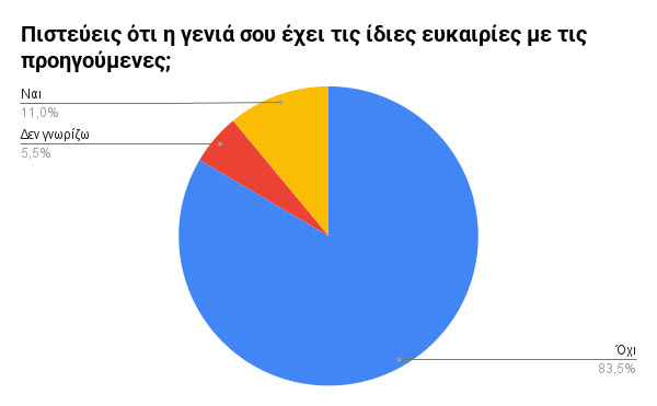 Η πλειονότητα των νέων θεωρεί ότι οι ευκαιρίες που είχαν οι προηγούμενες γενιές, ειδικά για εργασία και εξέλιξη, δεν υπάρχουν πια. Η σημερινή γενιά δυσκολεύεται να βρει σταθερές θέσεις εργασίας, ενώ οι προοπτικές για το μέλλον τους φαίνονται περιορισμένες. Οι νέοι θεωρούν ότι το κράτος δεν παρέχει τα εργαλεία και την υποστήριξη που χρειάζονται για να δημιουργήσουν ένα καλύτερο μέλλον για τους εαυτούς τους.