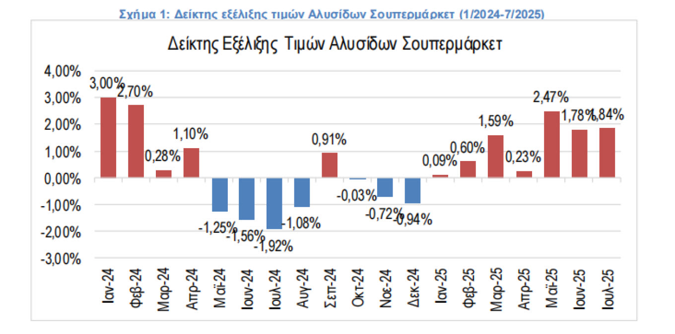 Αναλυτικότερα, ο πληθωρισμός στις αλυσίδες σουπερμάρκετ είναι της τάξης του +1,84% τον Ιούλιο 2025 σε σχέση με τον Ιούλιο 2024 (αντίστοιχος με το πληθωρισμό 1,78% τον Ιούνιο 2025). Σημειώνεται ότι οι τιμές του Ιουλίου 2025 σε σχέση με τον προηγούμενο μήνα Ιούνιο 2025 καταγράφονται με μικρή μείωση κατά -0,24%. Συνολικά το κυλιόμενο 12μηνο (Ιούλιος 2024-Ιούνιος 2025) καταγράφει οριακή αύξηση +0,56%.