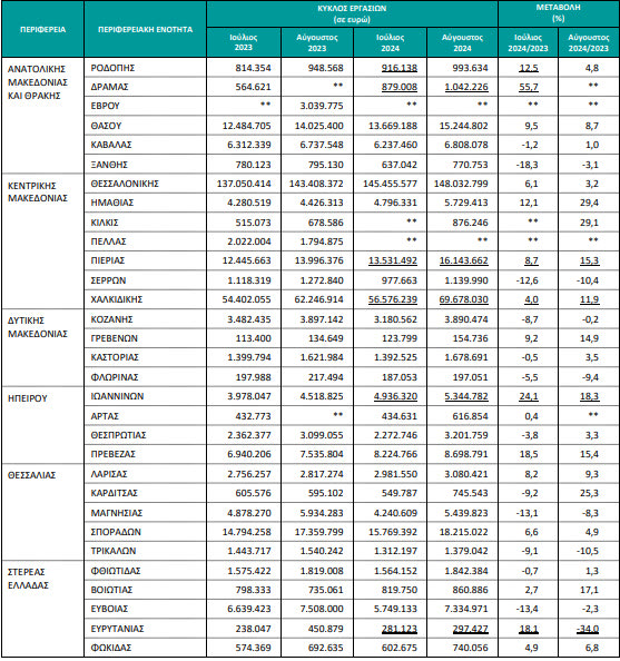 Για τις Περιφερειακές Ενότητες με συνεισφορά στον συνολικό κύκλο εργασιών έτους 2023 μεγαλύτερη από 1,0% (Πίνακας 1), η μεγαλύτερη αύξηση στον κύκλο εργασιών τον Αύγουστο 2024 σε σύγκριση με τον Αύγουστο 2023 παρατηρήθηκε στην Περιφερειακή Ενότητα Ρόδου (34,0%) και η μικρότερη αύξηση (3,2%) καταγράφηκε στην Περιφερειακή Ενότητα Θεσσαλονίκης.