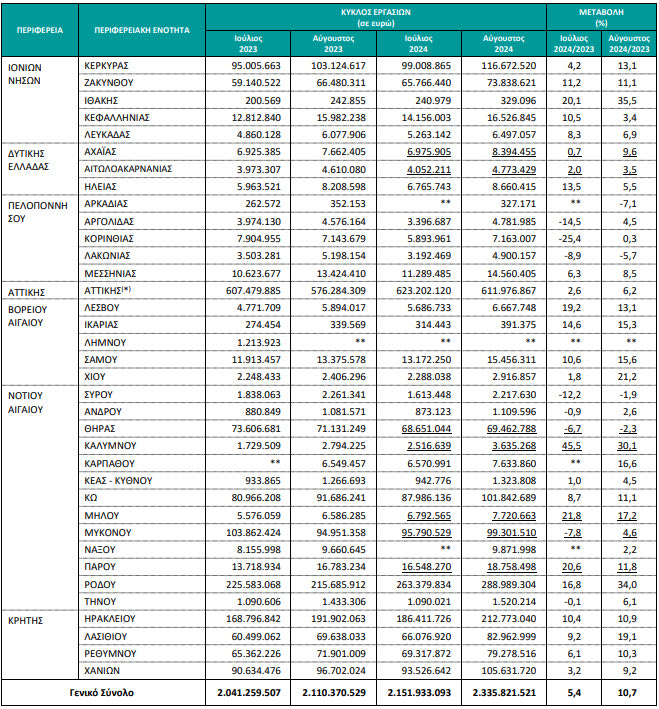 Αθροιστικά για τις επιχειρήσεις στους κλάδους των Καταλυμάτων και των Υπηρεσιών Εστίασης (κλάδοι 55 και 56 της ταξινόμησης NACE Αναθ. 2), με υποχρέωση τήρησης διπλογραφικών βιβλίων, για τις οποίες υπάρχουν διαθέσιμα στοιχεία σε μηνιαία βάση, ο κύκλος εργασιών τον Αύγουστο 2024 ανήλθε σε 2.335.821.521 ευρώ, σημειώνοντας αύξηση 10,7% σε σχέση με τον Αύγουστο 2023, όπου είχε ανέλθει σε 2.110.370.529 ευρώ.