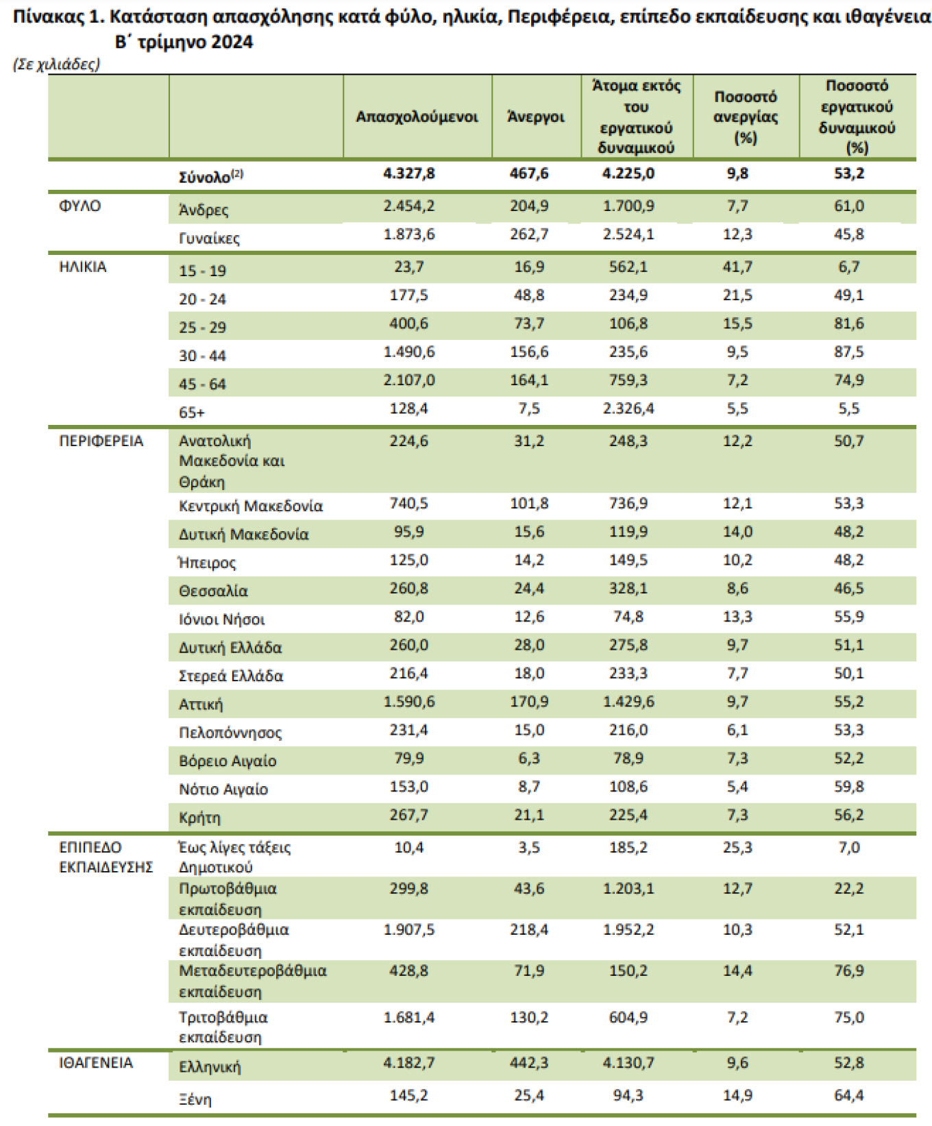 Ειδικότερα, τα άτομα εκτός του εργατικού δυναμικού κάτω των 75 ετών, ανήλθαν σε 2.994.624. Το ποσοστό τους μειώθηκε κατά 1,8% σε σχέση με το προηγούμενο τρίμηνο και κατά 1,5% σε σχέση με το αντίστοιχο τρίμηνο του προηγούμενου έτους.