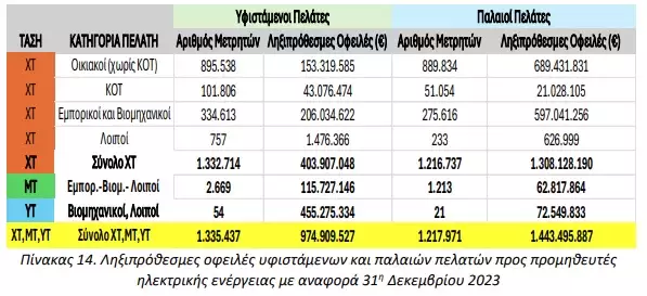 Ενδεικτικό είναι ότι οι ληξιπρόθεσμες οφειλές του συνόλου των καταναλωτών στη χώρα μας έφτασαν το 1,44 δισ. ευρώ στην περίπτωση παλαιών πελατών που έχουν αλλάξει προμηθευτή ρεύματος, συν άλλα 974 εκατ. ευρώ για υφιστάμενους πελάτες.Το σύνολο και των δύο αγγίζει τα 2,4 δισ. ευρώ, ποσό ενδεικτικό του προβλήματος που υπάρχει στην αγορά.