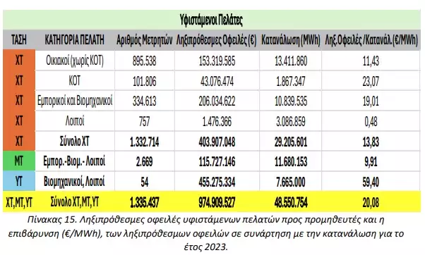 Αυτό δεν σημαίνει ότι από τα 15 π.χ. λεπτά/KWh που στοίχιζε πέρυσι ένα τιμολόγιο, τα 5 λεπτά ήταν το αποτέλεσμα των ληξιπρόθεσμων. Είναι, όμως, μια ένδειξη που δείχνει το πόσο θα χρειαζόταν να ανεβάσουν οι προμηθευτές τα τιμολόγια προκειμένου να καλυφθεί πλήρως η τρύπα των ληξιπρόθεσμων.