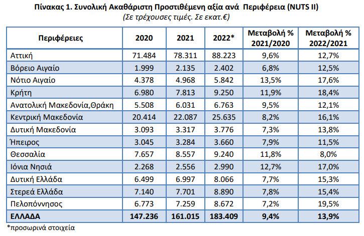 Αύξηση 13,9% σημείωσε το 2022 σε σχέση με το 2021 η Ακαθάριστη Προστιθέμενη Αξία (ΑΠΑ) στο σύνολο της χώρας, σύμφωνα με τους Περιφερειακούς Λογαριασμούς από την ΕΛΣΤΑΤ.