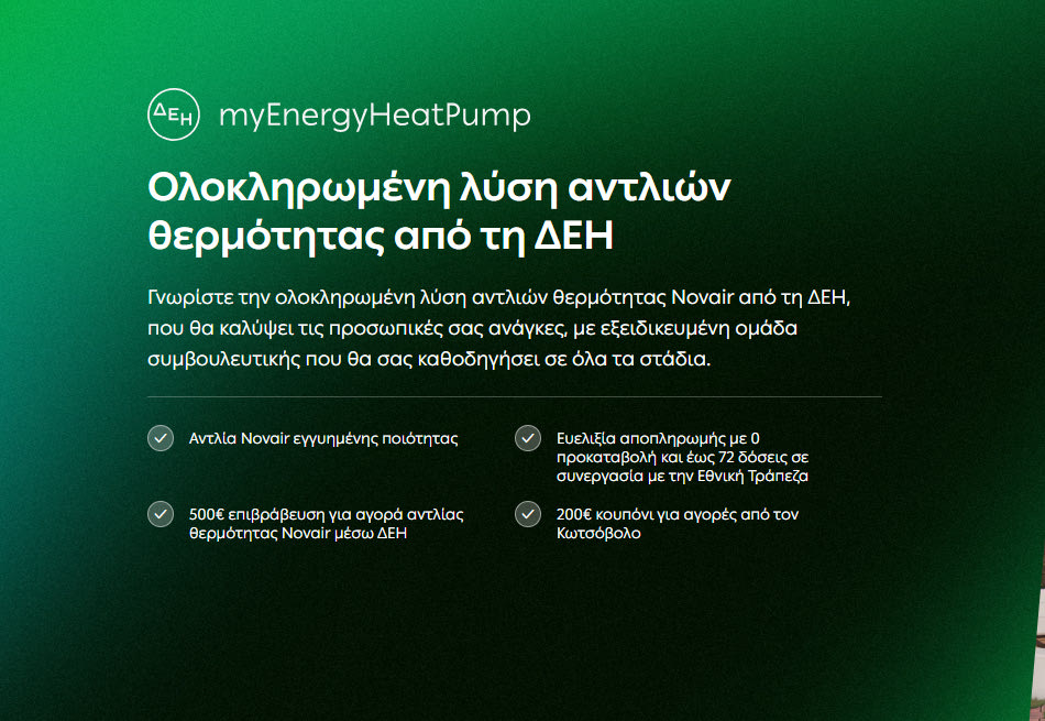 Η ΔΕΗ φέρνει μια λύση που συνδυάζει υψηλή ενεργειακή απόδοση και σημαντική εξοικονόμηση κόστους, ενώ παράλληλα συμβάλλει ουσιαστικά στην προστασία του περιβάλλοντος. Το ΔΕΗ myEnergy HeatPump είναι μία ολοκληρωμένη λύση για εγκατάσταση αντλιών θερμότητας Novair, που ανταποκρίνονται πλήρως στις σύγχρονες ανάγκες των νοικοκυριών.