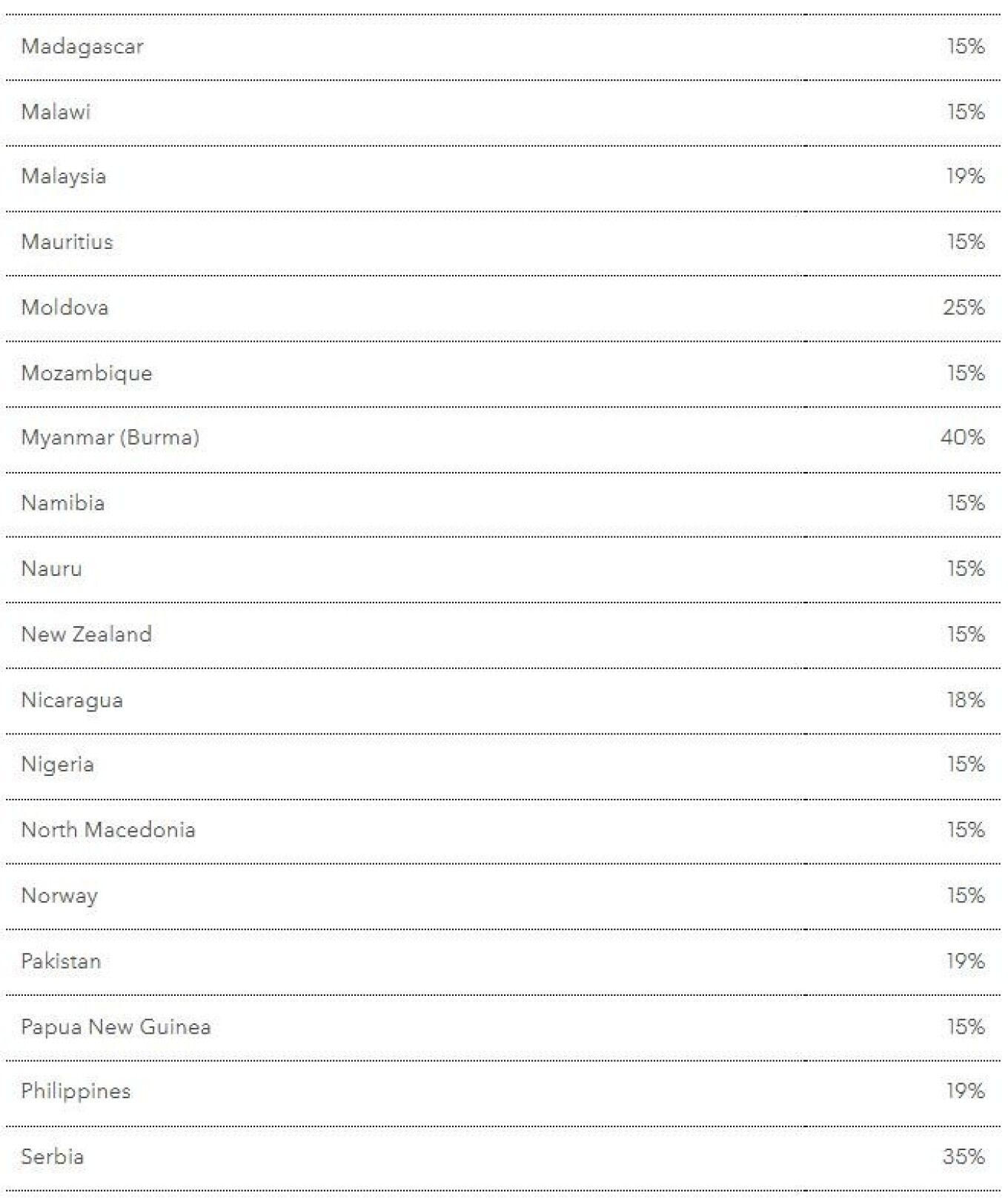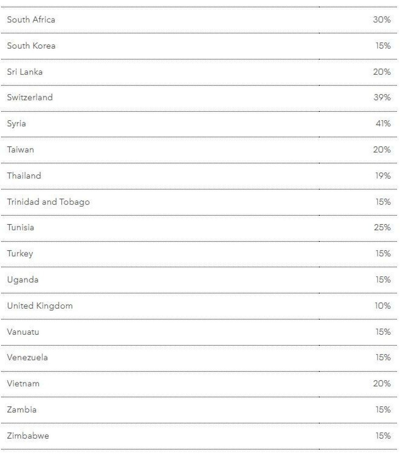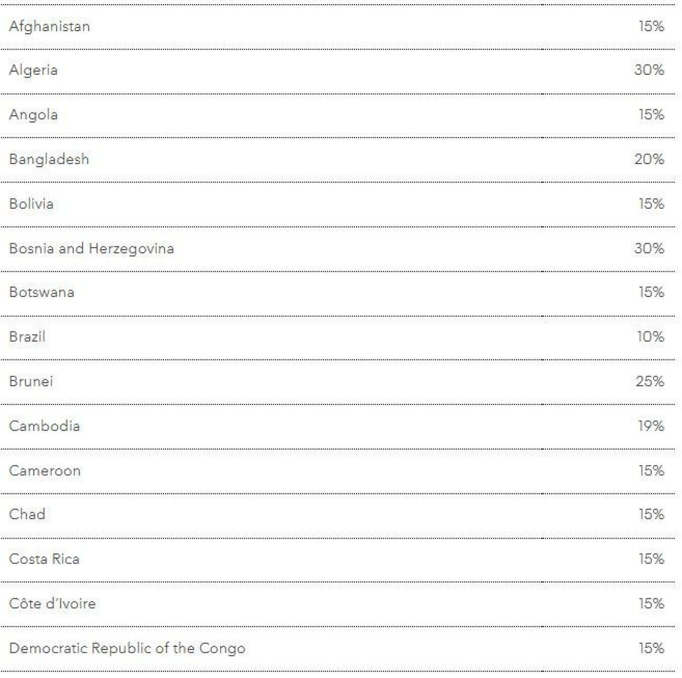 Γενικά, οι περισσότερες χώρες από αυτές που αναφέρονται στο παράρτημα του διατάγματος του προέδρου Τραμπ υπόκεινται σε δασμούς 15%, όμως κάποιες χώρες είναι αντιμέτωπες με διπλάσιους ή υψηλότερους, ιδίως η Νότια Αφρική (30%), η Σερβία (35%) και η Ελβετία (39%).