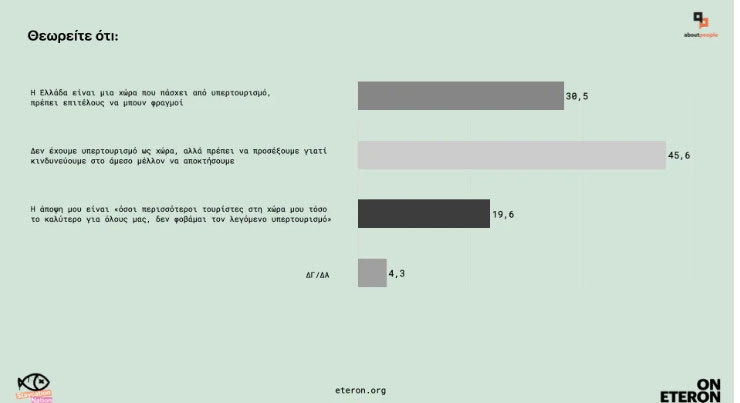 - Το 45,6% θεωρεί ότι η χώρα δεν αντιμετωπίζει ακόμη πρόβλημα υπερτουρισμού, αλλά απαιτείται προσοχή στο μέλλον.