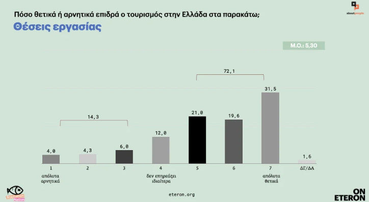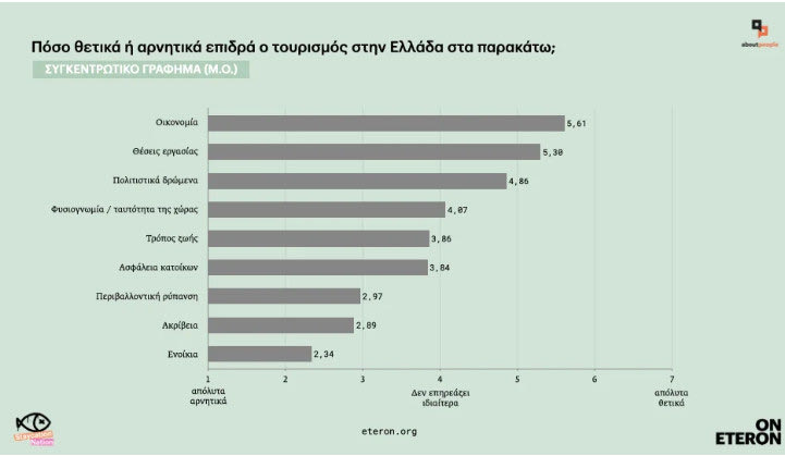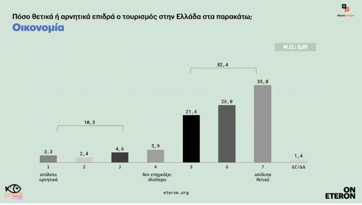 Πιο αναλυτικά, μέσα από την έρευνα προκύπτει, πως οι πολίτες αναγνωρίζουν κυρίως θετικά όσον αφορά την επίδραση του τουρισμού στην οικονομία (μ.ο. 5,61) και τις θέσεις εργασίας (μ.ο. 5,30). Συγκεκριμένα, όσον αφορά την οικονομία γενικά, το 82,4% βλέπει θετική την επίδραση του τουρισμού, ενώ για την συνεισφορά στην αγορά εργασίας το 72,1% θεωρεί ότι συμβάλλει θετικά.
