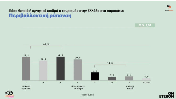 Με βάση τα ευρήματα της έρευνας, οι αρνητικές επιπτώσεις γίνονται όλο και πιο αντιληπτές από τους κατοίκους, με το 63.5% να ανησυχεί για τις περιβαλλοντικές συνέπειες, την ώρα που το 82.4% να αναγνωρίζει την οικονομική συμβολή του τουρισμού στην οικονομία.