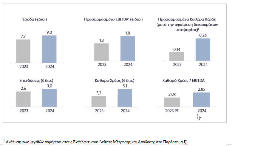 Παρά την αύξηση των επενδύσεων ο δείκτης καθαρό χρέος/EBITDA διαμορφώθηκε σε 2,8x το 2024, αρκετά χαμηλότερα από το όριο του 3,5x που έχει θέσει η ΔΕΗ.