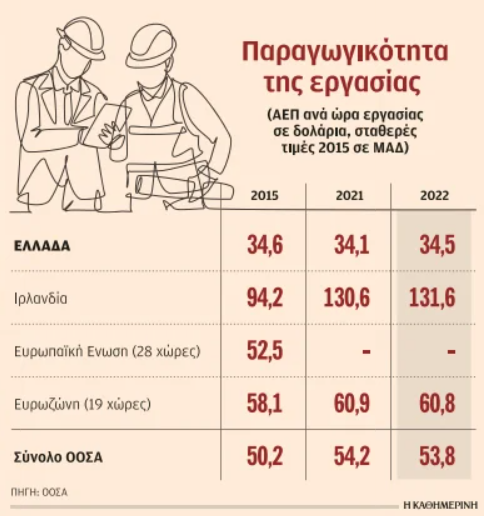 Επιπλέον, όπως σημειώνει ρεπορτάζ της Καθημερινής, η Ελλάδα είναι η τελευταία σε ό,τι αφορά τα επίπεδα παραγωγικότητας μεταξύ των ευρωπαϊκών χωρών-μελών του ΟΟΣΑ και η 4η από το τέλος μεταξύ των χωρών-μελών του συνολικά.