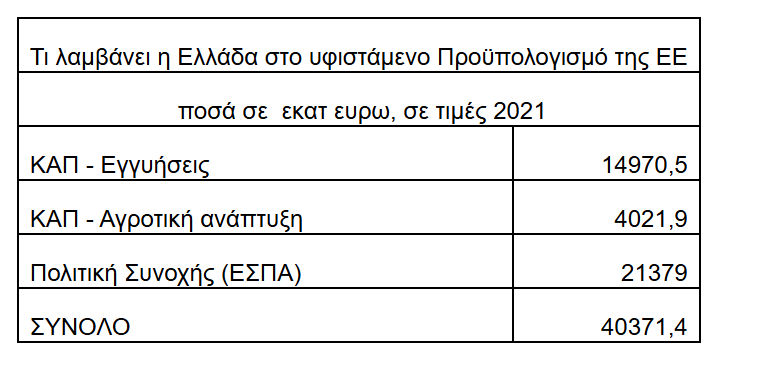 Το τι δικαιούται η Ελλάδα σήμερα φαίνεται σε έναν βαθμό στις τιμές που δημοσίευσε η Ευρωπαϊκή Επιτροπή το 2021 και είναι εκπεφρασμένες σε τρέχουσα αξία. Σε τιμές 2021 λοιπόν η Ελλάδα δικαιούται σήμερα για την περίοδο 2021- 2027 συνολικά 40,37 δισ. ευρώ από 3 πηγές που τροφοδοτούν το ΕΣΠΑ και την ΚΑΠ.